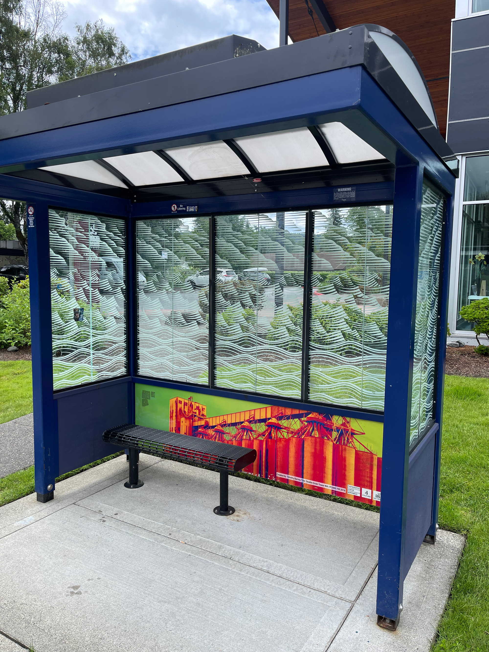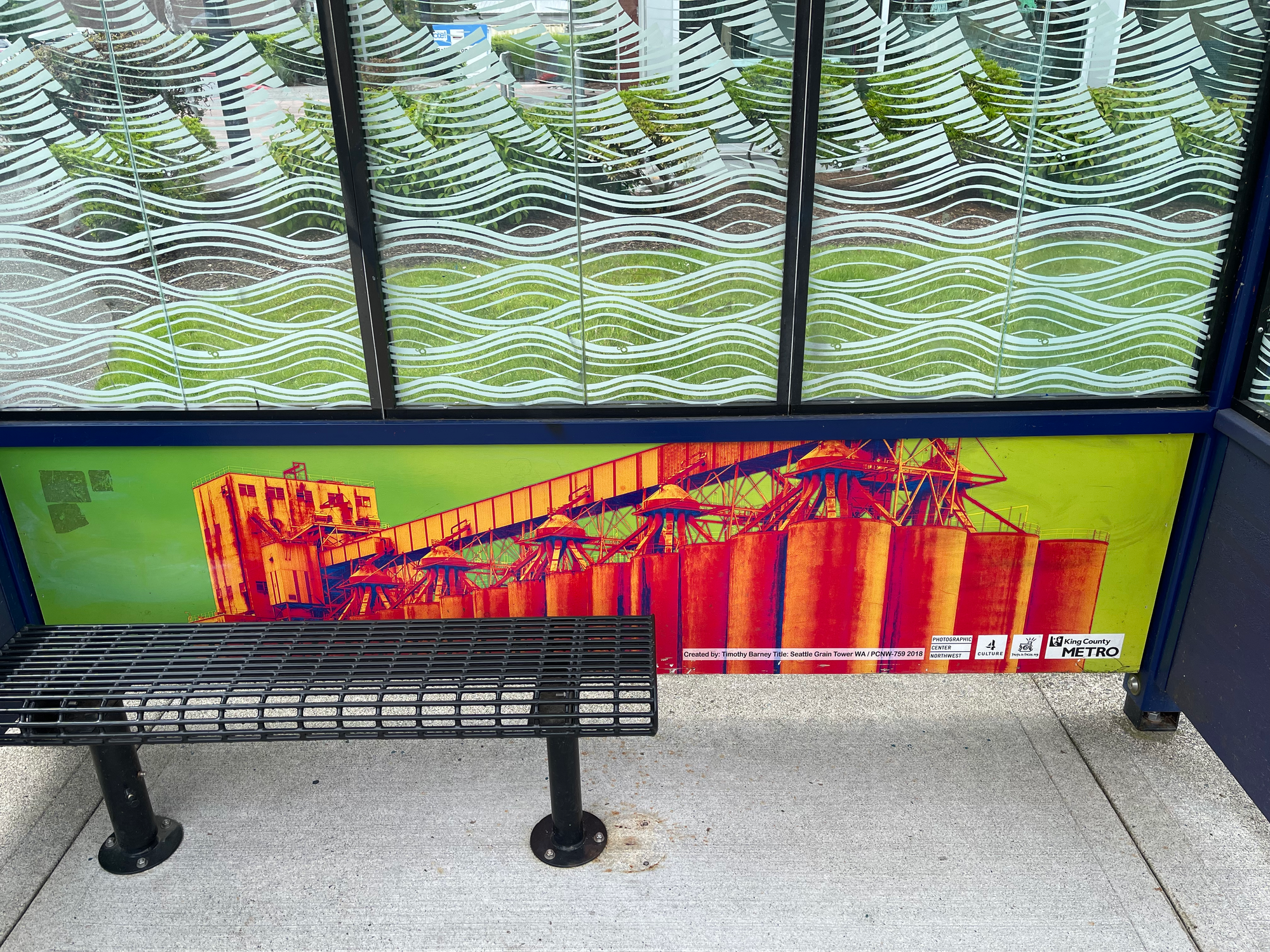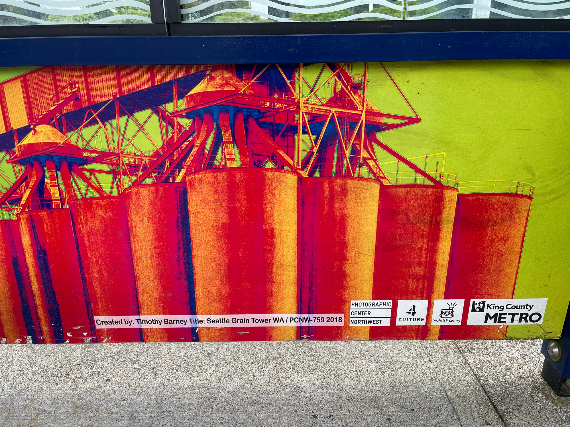 I also recalled that Tim told me one of his photographs was on one of the bus stops in Fall City. I vaguely remembered that I thought he said it was in front of the Fall City Library, so I pulled out Google Maps to see how far away it was... And it was 100 feet away, two doors down! So I walked over there and sure enough, there was a bus stop right in front of the library and it was graced with a nice photograph of a grain silo by Tim Barney. Very cool.